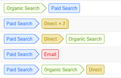 We have two conversions here that Google Analytics would count as paid traffic (the first two). While paid search was a contributing factor in all five conversions, because of last click attribution, organic and email traffic are considered the stronger role in causing the user to convert.