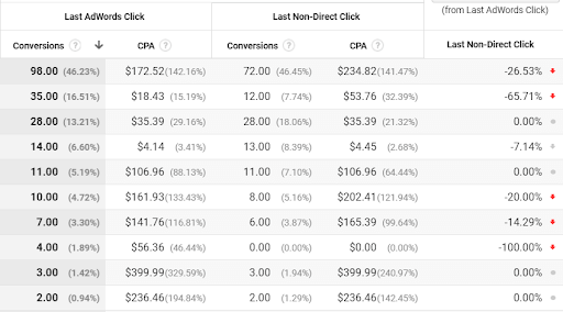 Here is an example where we’re comparing Last Google Ads Click (which is the same method that Ads uses) with Last Non-Direct Click.