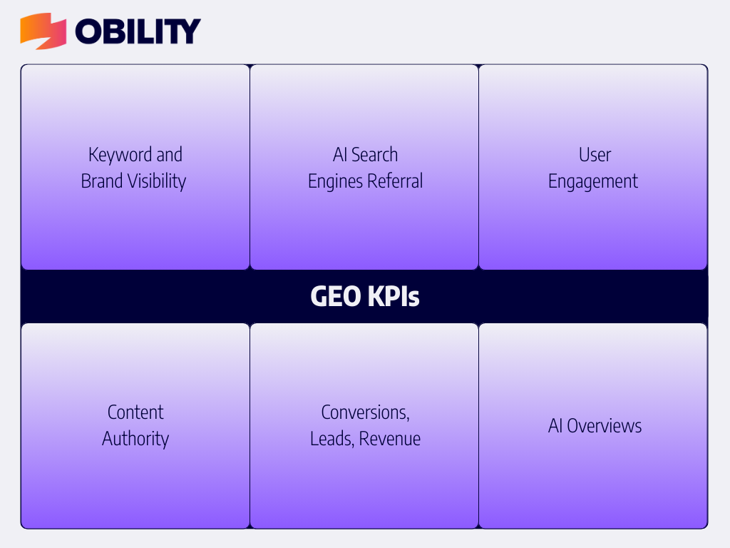 GEO focuses on visibility in AI-driven platforms. Tracking brand mentions, visibility, CTR, engagement, and conversions helps ensure your content is recognized and drives results.